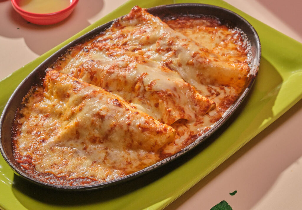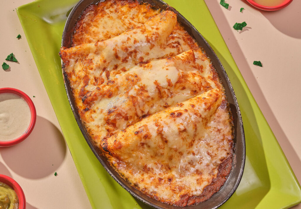 Three flour tortillas filled with shredded chicken and/or shredded beef Acapulco style. Bathed with our Mexican sauce, sour cream and gratin with plenty of mozzarella cheese.