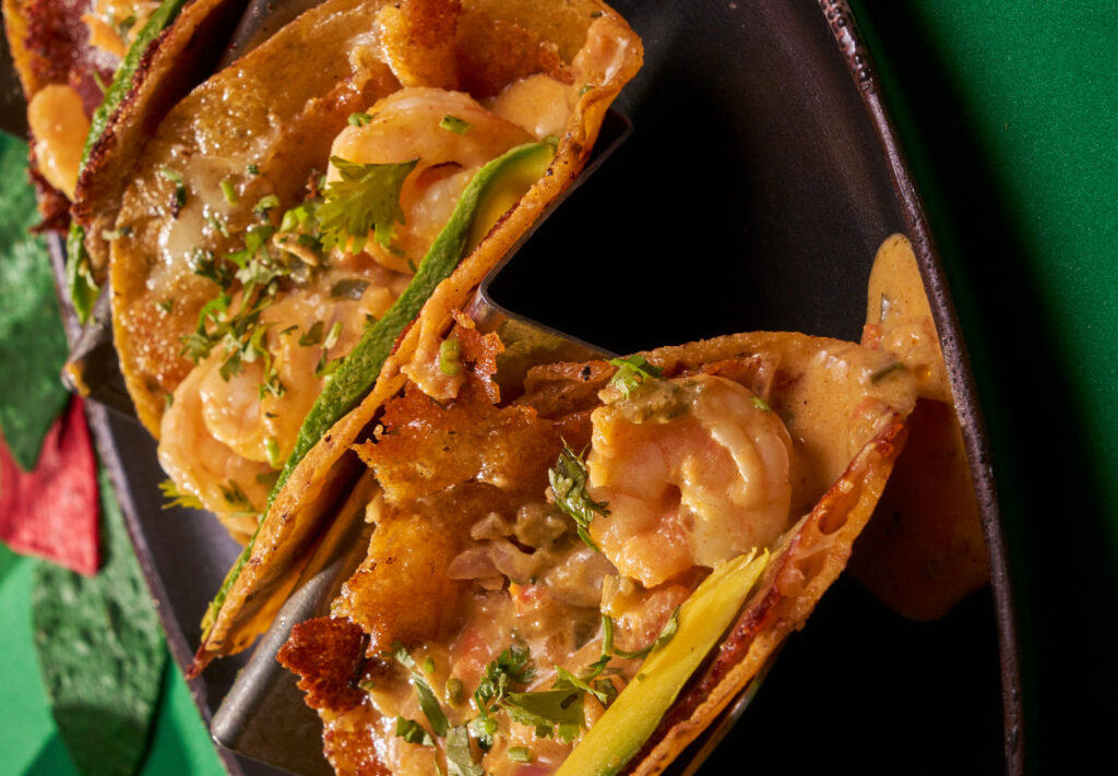 Shrimp in a creamy sauce based on tomatoes, onion and paprika, served with a crust of melted cheese, slices of avocado and a topped with cilantro and onion on a corn tortilla