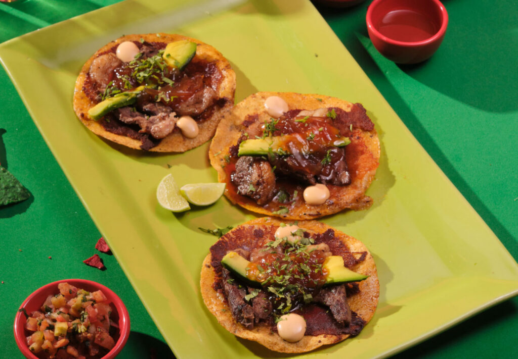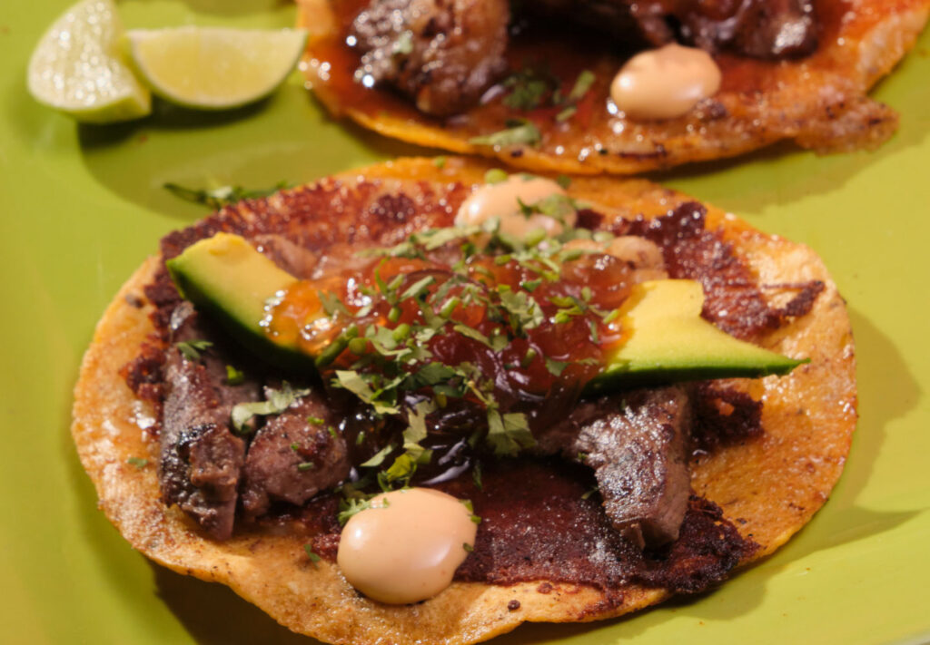 Grilled Picaña according to the term of your preference, sliced avocado, mayo chipotle and a crust of melted cheese topped with cilantro and onion on a corn tortilla.